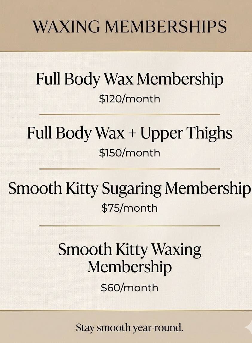 Our Waxing Memberships are designed for clients who want consistent, silky-smooth results without paying full price every visit. With an affordable monthly plan, you’ll enjoy professional waxing services, priority booking, and exclusive member perks — all while maintaining long-lasting smoothness.